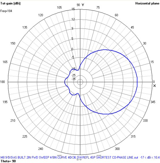M8 Computer Modeling Results The M8 vertical stack modeled here uses 2 vertical stacked 9 1/2" x 9" 4 bays tied together with a tapered co-phase line. These models were ran with a pair of 36" high x 40" wide curved reflectors with 2" x 4" openings (2" x 4" wire fence). Better front to back ratios and slightly higher gain on UHF would be seen with a screen that has smaller openings such as 1" x 2" wire fence. |